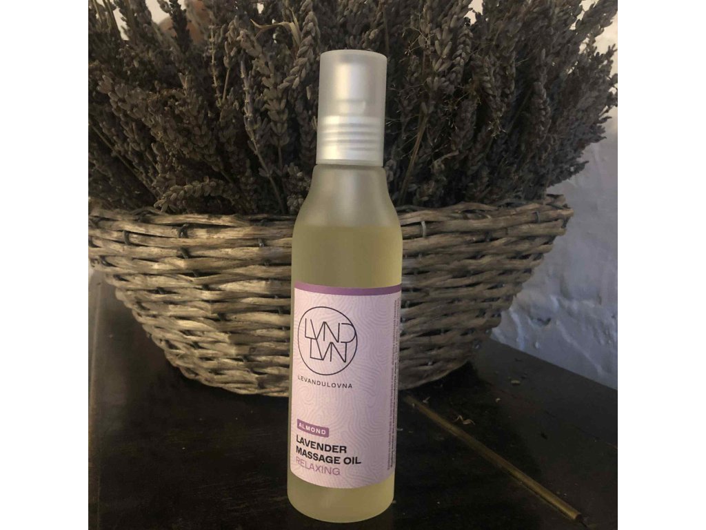 Levandulový masážní olej 150ml - složení: Mandlový masážní olej s esenciálním levandulovým olejem destilovaným u nás na farmě. Prunus Amygdalus Dulcis Oil, Lavandula Angustifolia Essential Oil. Ve skleněné lahvičce s dávkovačem (pumpička)